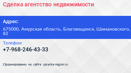 Сделка, агентство недвижимости по адресу 675000, Амурская область, Благовещенск, Шимановского, 82 в дальнейшем Организация, размещена в следующих категориях: