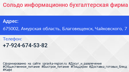 Сольдо, информационно-бухгалтерская фирма по адресу 675002, Амурская область, Благовещенск, Чайковского, 7 в дальнейшем Организация, размещена в следующих категориях: