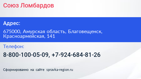 Союз Ломбардов по адресу 675000, Амурская область, Благовещенск, Красноармейская, 141 в дальнейшем Организация, размещена в следующих категориях: