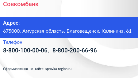 Совкомбанк по адресу 675000, Амурская область, Благовещенск, Калинина, 61 в дальнейшем Организация, размещена в следующих категориях: