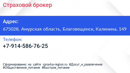 Страховой брокер по адресу 675028, Амурская область, Благовещенск, Калинина, 149 в дальнейшем Организация, размещена в следующих категориях: