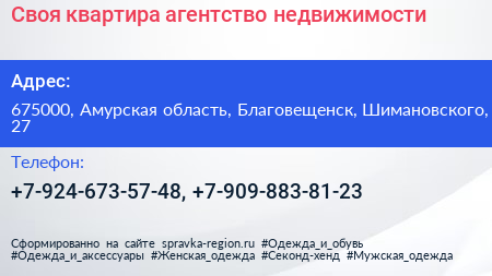Своя квартира, агентство недвижимости по адресу 675000, Амурская область, Благовещенск, Шимановского, 27 в дальнейшем Организация, размещена в следующих категориях:
