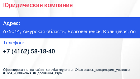Юридическая компания по адресу 675014, Амурская область, Благовещенск, Кольцевая, 66 в дальнейшем Организация, размещена в следующих категориях: