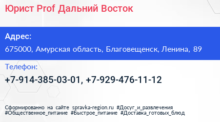 Юрист-Prof Дальний Восток по адресу 675000, Амурская область, Благовещенск, Ленина, 89 в дальнейшем Организация, размещена в следующих категориях: