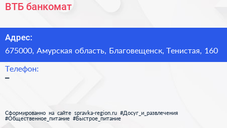 ВТБ, банкомат по адресу 675000, Амурская область, Благовещенск, Тенистая, 160 в дальнейшем Организация, размещена в следующих категориях:
