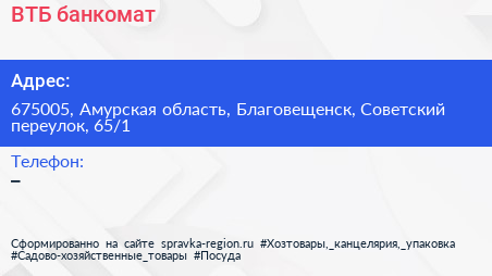 ВТБ, банкомат по адресу 675005, Амурская область, Благовещенск, Советский переулок, 65/1 в дальнейшем Организация, размещена в следующих категориях: