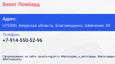 Визит Ломбард по адресу 675000, Амурская область, Благовещенск, Шевченко, 85 в дальнейшем Организация, размещена в следующих категориях: