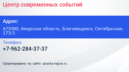 Центр современных событий по адресу 675000, Амурская область, Благовещенск, Октябрьская, 173/1 в дальнейшем Организация, размещена в следующих категориях: