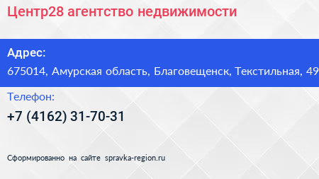 Центр28, агентство недвижимости по адресу 675014, Амурская область, Благовещенск, Текстильная, 49 в дальнейшем Организация, размещена в следующих категориях:
