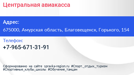 Центральная авиакасса по адресу 675000, Амурская область, Благовещенск, Горького, 154 в дальнейшем Организация, размещена в следующих категориях: