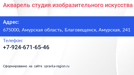 Акварель, студия изобразительного искусства по адресу 675000, Амурская область, Благовещенск, Амурская, 241 в дальнейшем Организация, размещена в следующих категориях: