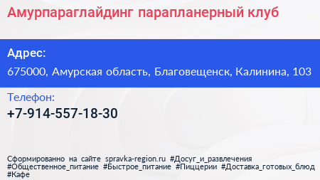 Амурпараглайдинг, парапланерный клуб по адресу 675000, Амурская область, Благовещенск, Калинина, 103 в дальнейшем Организация, размещена в следующих категориях: