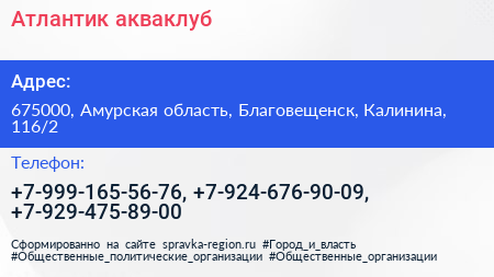 Атлантик, акваклуб по адресу 675000, Амурская область, Благовещенск, Калинина, 116/2 в дальнейшем Организация, размещена в следующих категориях: