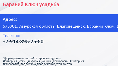 Бараний Ключ, усадьба по адресу 675901, Амурская область, Благовещенск, Бараний ключ, 1 в дальнейшем Организация, размещена в следующих категориях: