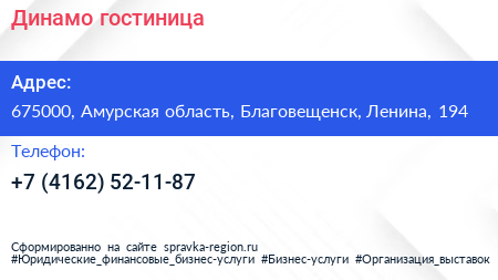 Динамо, гостиница по адресу 675000, Амурская область, Благовещенск, Ленина, 194 в дальнейшем Организация, размещена в следующих категориях: