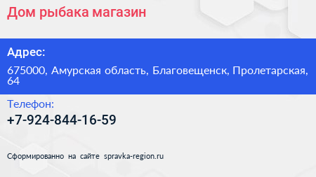 Дом рыбака, магазин по адресу 675000, Амурская область, Благовещенск, Пролетарская, 64 в дальнейшем Организация, размещена в следующих категориях: