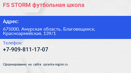 FS STORM, футбольная школа по адресу 675000, Амурская область, Благовещенск, Красноармейская, 139/1 в дальнейшем Организация, размещена в следующих категориях:
