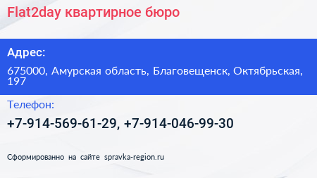 Flat2day, квартирное бюро по адресу 675000, Амурская область, Благовещенск, Октябрьская, 197 в дальнейшем Организация, размещена в следующих категориях:
