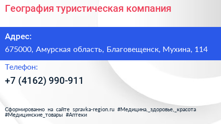 География, туристическая компания по адресу 675000, Амурская область, Благовещенск, Мухина, 114 в дальнейшем Организация, размещена в следующих категориях: