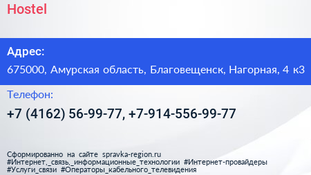 Hostel по адресу 675000, Амурская область, Благовещенск, Нагорная, 4 к3 в дальнейшем Организация, размещена в следующих категориях:
