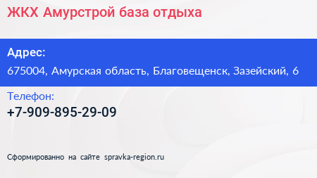 ЖКХ Амурстрой, база отдыха по адресу 675004, Амурская область, Благовещенск, Зазейский, 6 в дальнейшем Организация, размещена в следующих категориях: