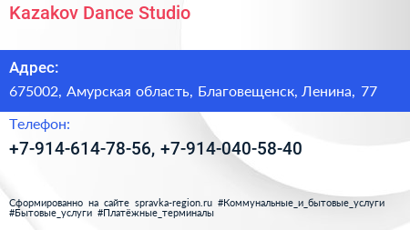 Kazakov Dance Studio по адресу 675002, Амурская область, Благовещенск, Ленина, 77 в дальнейшем Организация, размещена в следующих категориях:
