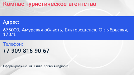 Компас, туристическое агентство по адресу 675000, Амурская область, Благовещенск, Октябрьская, 173/1 в дальнейшем Организация, размещена в следующих категориях: