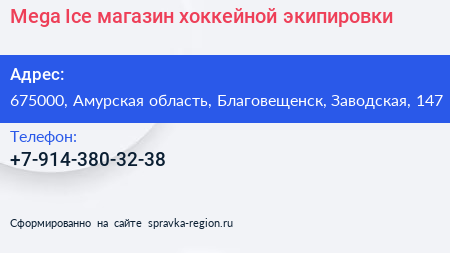 Mega Ice, магазин хоккейной экипировки по адресу 675000, Амурская область, Благовещенск, Заводская, 147 в дальнейшем Организация, размещена в следующих категориях: