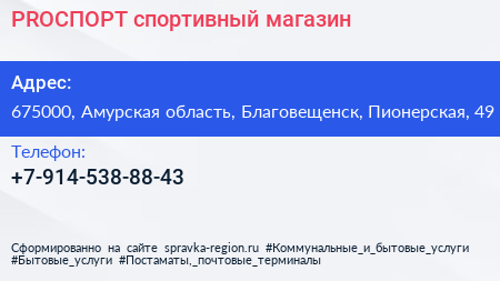 PROСПОРТ, спортивный магазин по адресу 675000, Амурская область, Благовещенск, Пионерская, 49 в дальнейшем Организация, размещена в следующих категориях: