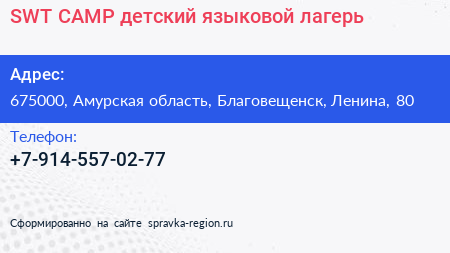 SWT CAMP, детский языковой лагерь по адресу 675000, Амурская область, Благовещенск, Ленина, 80 в дальнейшем Организация, размещена в следующих категориях: