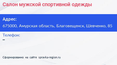 Салон мужской спортивной одежды по адресу 675000, Амурская область, Благовещенск, Шевченко, 85 в дальнейшем Организация, размещена в следующих категориях: