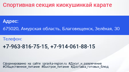 Спортивная секция киокушинкай карате по адресу 675020, Амурская область, Благовещенск, Зелёная, 30 в дальнейшем Организация, размещена в следующих категориях: