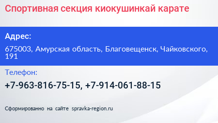 Спортивная секция киокушинкай карате по адресу 675003, Амурская область, Благовещенск, Чайковского, 191 в дальнейшем Организация, размещена в следующих категориях: