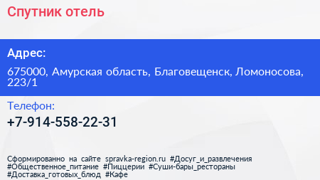 Спутник, отель по адресу 675000, Амурская область, Благовещенск, Ломоносова, 223/1 в дальнейшем Организация, размещена в следующих категориях: