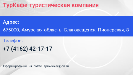 ТурКафе, туристическая компания по адресу 675000, Амурская область, Благовещенск, Пионерская, 8 в дальнейшем Организация, размещена в следующих категориях: