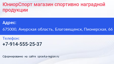 ЮниорСпорт, магазин спортивно-наградной продукции по адресу 675000, Амурская область, Благовещенск, Пионерская, 66 в дальнейшем Организация, размещена в следующих категориях:
