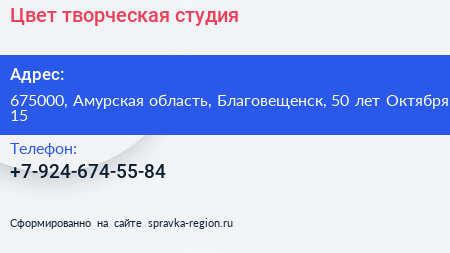 Цвет, творческая студия по адресу 675000, Амурская область, Благовещенск, 50 лет Октября, 15 в дальнейшем Организация, размещена в следующих категориях: