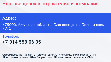 Благовещенская строительная компания по адресу 675000, Амурская область, Благовещенск, Больничная, 79/1 в дальнейшем Организация, размещена в следующих категориях: