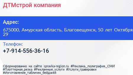 ДТМстрой, компания по адресу 675000, Амурская область, Благовещенск, 50 лет Октября, 29 в дальнейшем Организация, размещена в следующих категориях:
