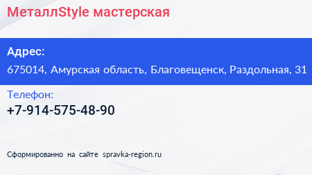 МеталлStyle, мастерская по адресу 675014, Амурская область, Благовещенск, Раздольная, 31 в дальнейшем Организация, размещена в следующих категориях: