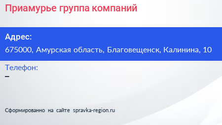 Приамурье, группа компаний по адресу 675000, Амурская область, Благовещенск, Калинина, 10 в дальнейшем Организация, размещена в следующих категориях: