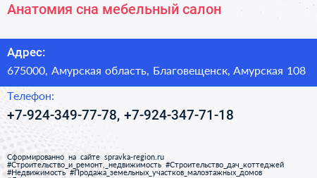 Анатомия сна, мебельный салон по адресу 675000, Амурская область, Благовещенск, Амурская 108 в дальнейшем Организация, размещена в следующих категориях: