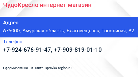 ЧудоКресло, интернет-магазин по адресу 675000, Амурская область, Благовещенск, Тополиная, 82 в дальнейшем Организация, размещена в следующих категориях: