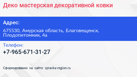 Деко, мастерская декоративной ковки по адресу 675530, Амурская область, Благовещенск, Плодопитомник, 4а в дальнейшем Организация, размещена в следующих категориях: