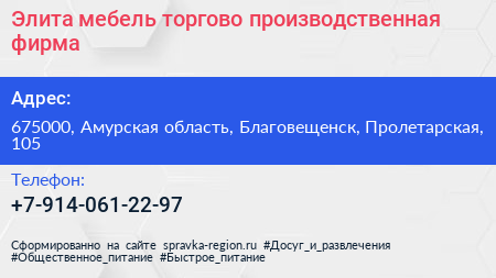 Элита мебель, торгово-производственная фирма по адресу 675000, Амурская область, Благовещенск, Пролетарская, 105 в дальнейшем Организация, размещена в следующих категориях:
