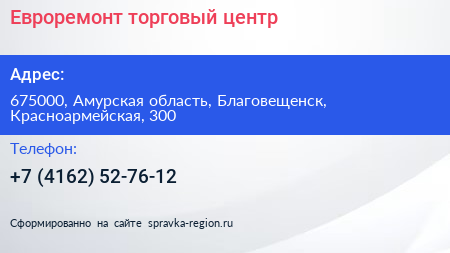 Евроремонт, торговый центр по адресу 675000, Амурская область, Благовещенск, Красноармейская, 300 в дальнейшем Организация, размещена в следующих категориях: