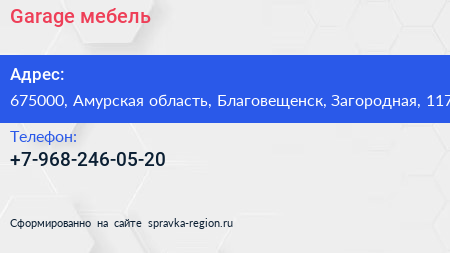 Garage мебель по адресу 675000, Амурская область, Благовещенск, Загородная, 117 в дальнейшем Организация, размещена в следующих категориях: