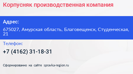 Корпусняк, производственная компания по адресу 675027, Амурская область, Благовещенск, Студенческая, 21 в дальнейшем Организация, размещена в следующих категориях: