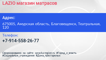 LAZIO, магазин матрасов по адресу 675005, Амурская область, Благовещенск, Театральная, 120 в дальнейшем Организация, размещена в следующих категориях: