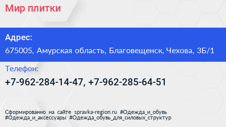 Мир плитки по адресу 675005, Амурская область, Благовещенск, Чехова, 3Б/1 в дальнейшем Организация, размещена в следующих категориях:
